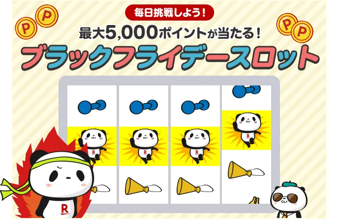 楽天ブラックフライデーでは、スロットで最大5,000ポイントを獲得するチャンスがあります。このキャンペーンでは、5,000ポイントが最大20本、10ポイントが最大34,000本当たります。
