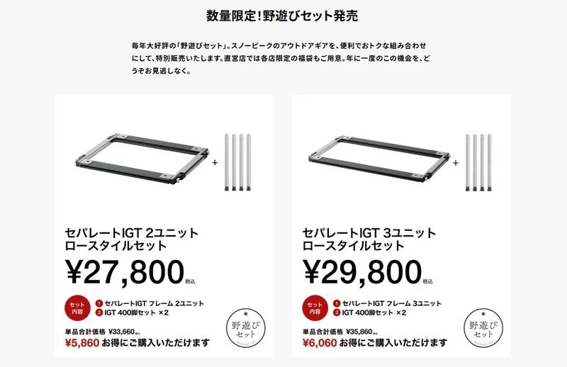 毎年人気の初売り限定セットは、スノーピークの定番ギアをお得に入手できる特別仕様。