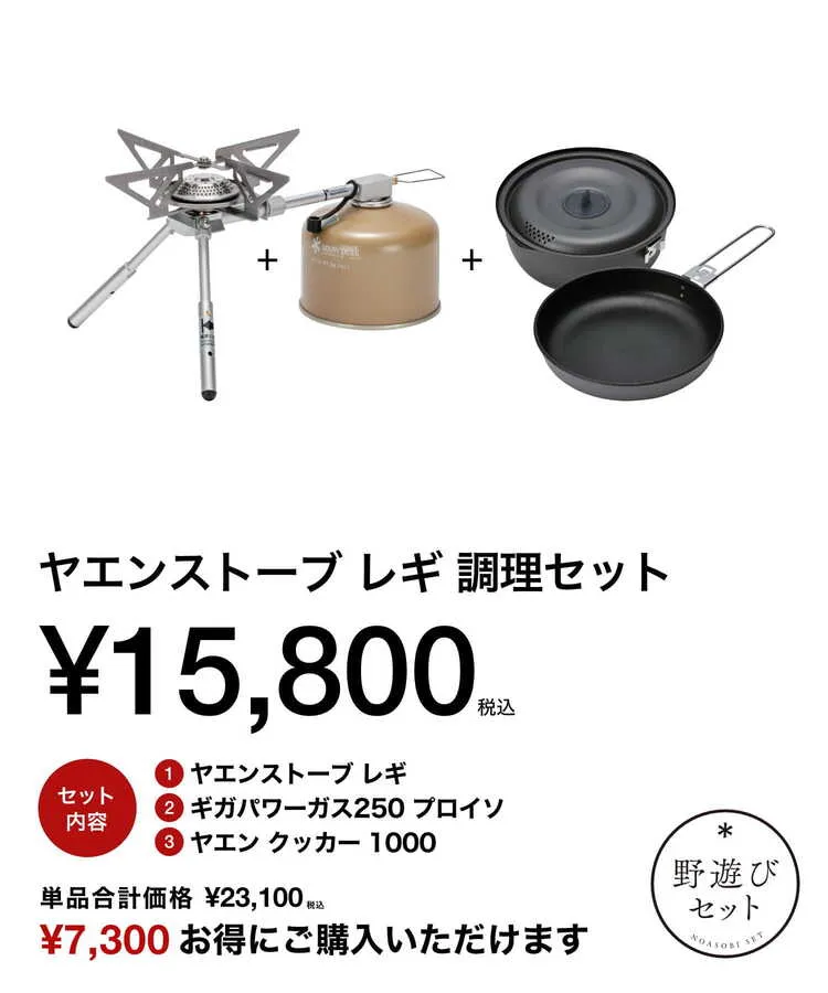 ヤエンストーブ レギ調理セットは、コンパクトながら本格的な調理が楽しめるソロキャンプ向けの実用セットです。安定性に優れたヤエンストーブ レギは低重心設計で扱いやすく、風の影響を受けにくいのが特長。あわせて使用できるヤエン クッカー1000は、煮る・焼く・炒めるといった調理を1台でこなせる万能クッカーです。さらにギガパワーガス250プロイソが付属し、購入後すぐに使える点も魅力。ソロキャンプや軽量装備を重視する方におすすめの実用性重視セットです。