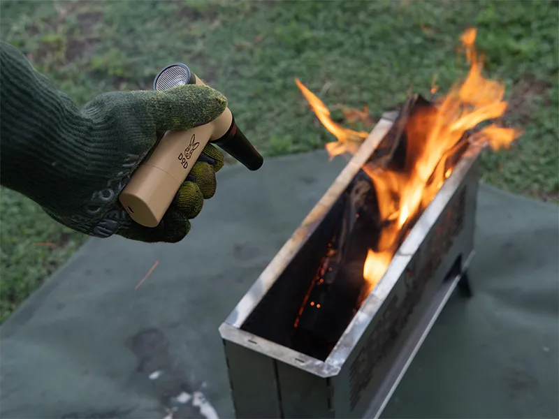 ここで登場するのがトバシマクリスT。細ノズルで火種にピンポイント送風すれば、炭も薪も一気に着火モードへ。うちわで扇ぐより圧倒的に効率がよく、寒い日の“火起こし待ち時間”が消えます。