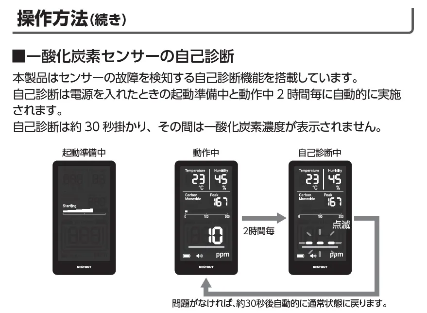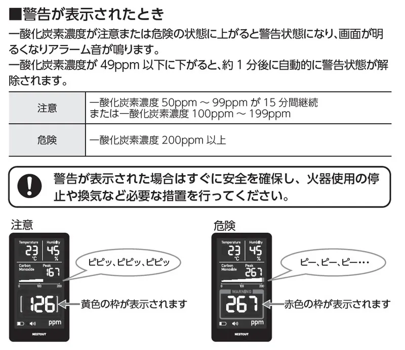- 濃度表示を確認し、安全レベル(0〜10ppm)に戻るまで再入室しない