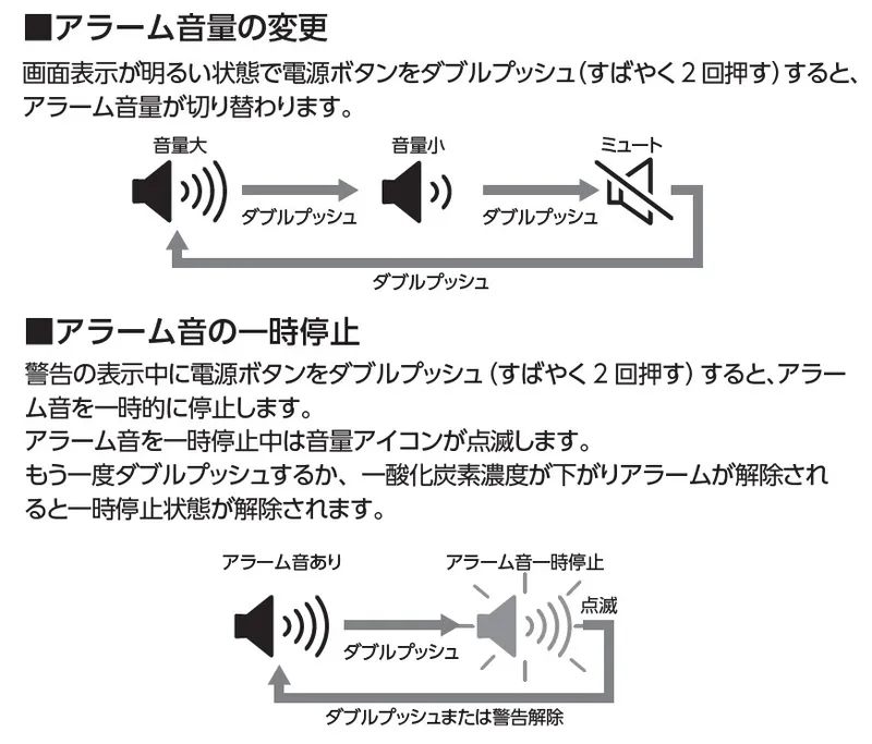 | アラーム音量 | 3段階(大・小・ミュート) | 同上 |