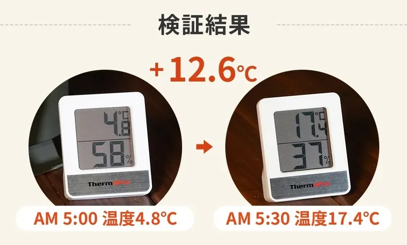 実際の検証では、テント内の気温が30分で約13℃も上昇するほどの実力です。