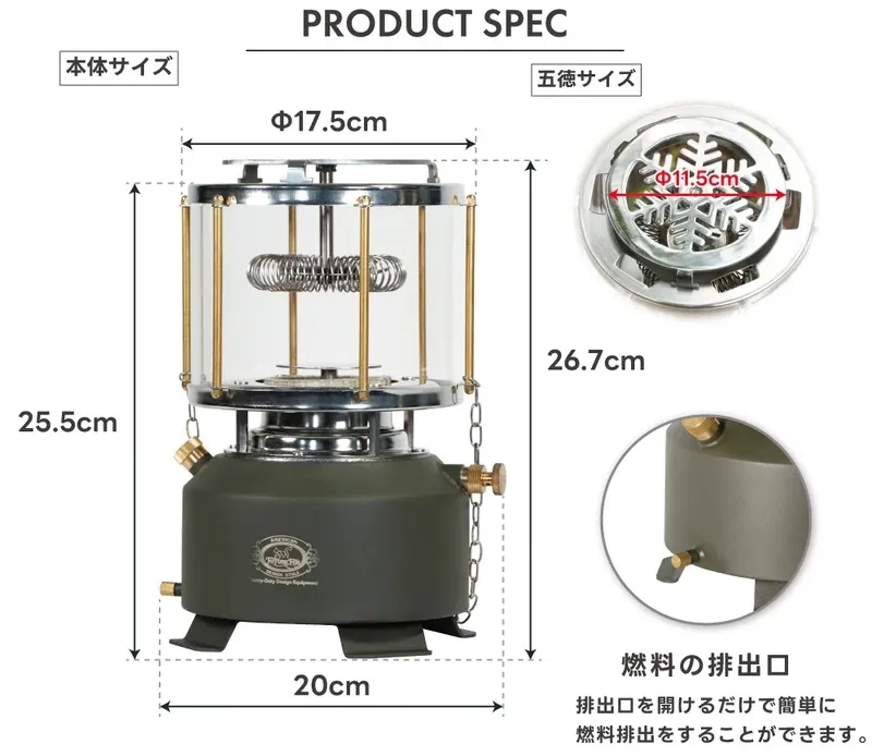 灯油またはパラフィンオイルが使用でき、扱いやすさと安全性を両立しています。
