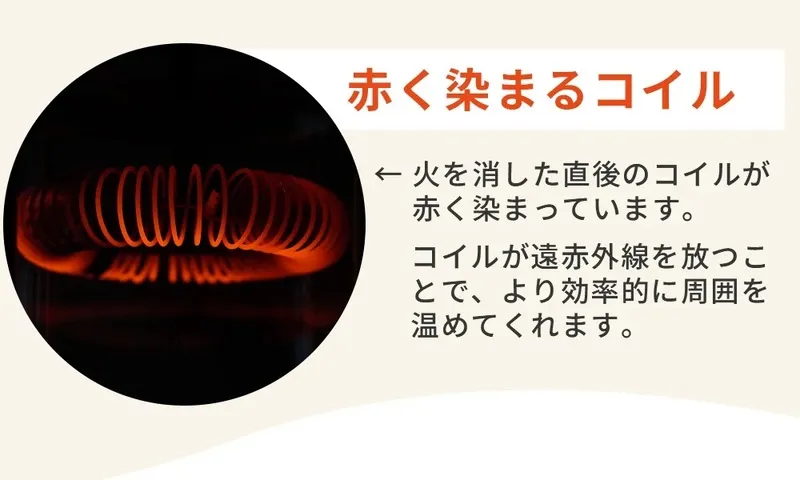 燃焼時にコイルが赤く染まり、遠赤外線のような柔らかいぬくもりを広げます。