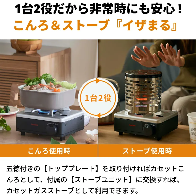 イワタニ「イザまる」は、カセットコンロカセットガスストーブの2つの役割を、1台で切り替えて使える新しい発想のガス機器です。