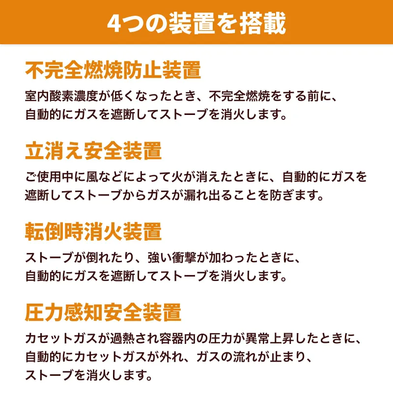 カセットガスを使う製品だからこそ、安全面への配慮がしっかり盛り込まれている点も特徴です。