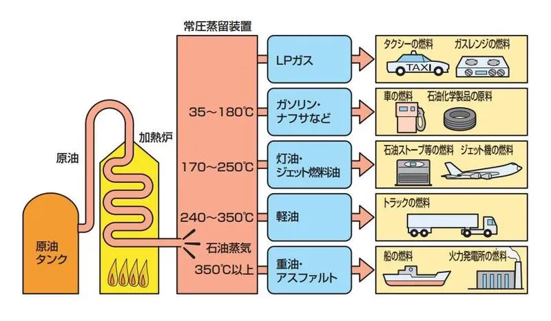 たとえば、軽い成分のガソリンは自動車用燃料、軽油はディーゼル車や発電用、重油は船舶や工業炉などに使われます。