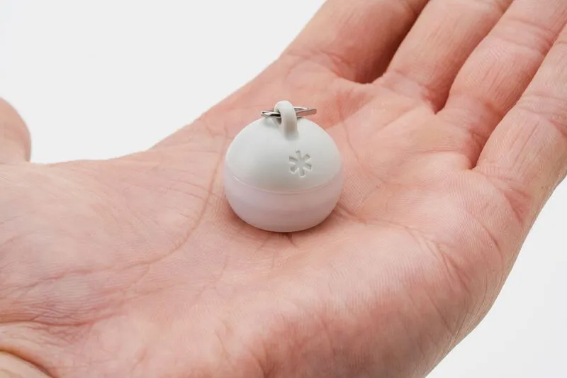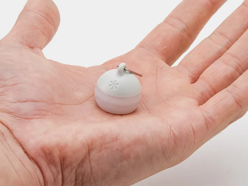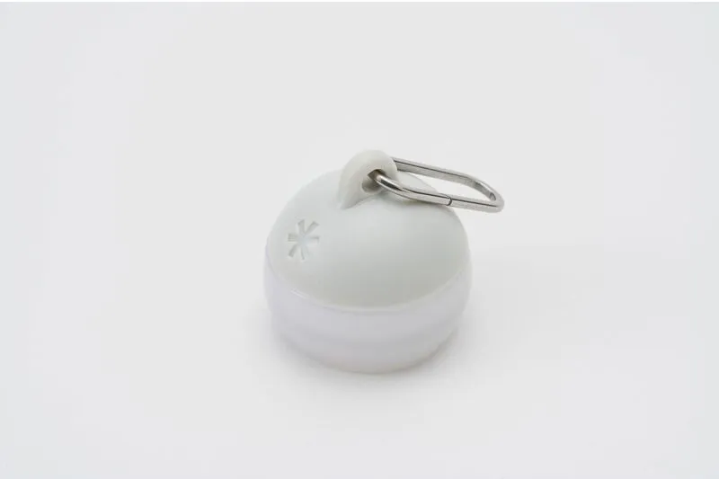 シリーズの中でも、つぶほおずきは広い範囲を照らすランタンというより、「手元を照らす」「目印にする」ことに向いたモデルです。指先でつまめるほど小さく、リング付きなので、ロープやキーチェーン、バッグなどに取り付けて使えます。