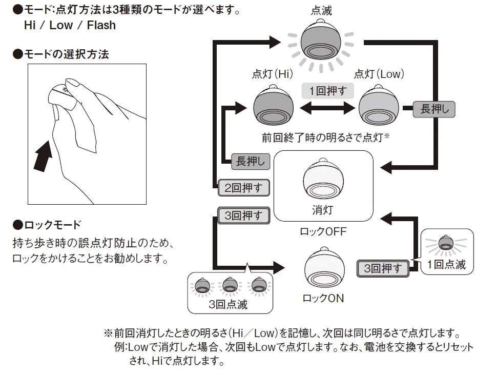 点灯モードHi/Low/Flash+ロック機能